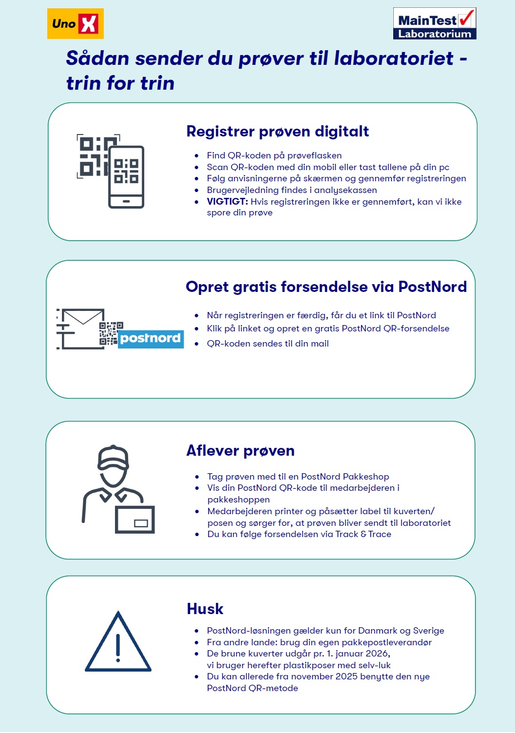 Fra 1. januar 2026 kan man ikke længere sende breve med PostNord. Vi har derfor introduceret en ny forsendelsesmetode for analyser. Herunder kan du læse om hvordan du gør fremover: